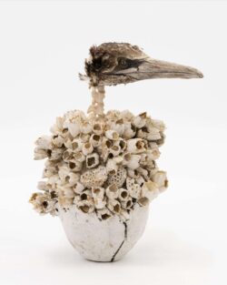 Guided by a blend of instinct, poetic attention, and deep connection with animals, I collect textural materials that hold memory and meaning. Each sculpture begins with exploration, often sparked by a found object. As the work unfolds, precision, intention, and detail guide me. Whether gathering natural elements from shorelines or repurposing discarded materials, I seek to give each fragment a second life through layered storytelling.
