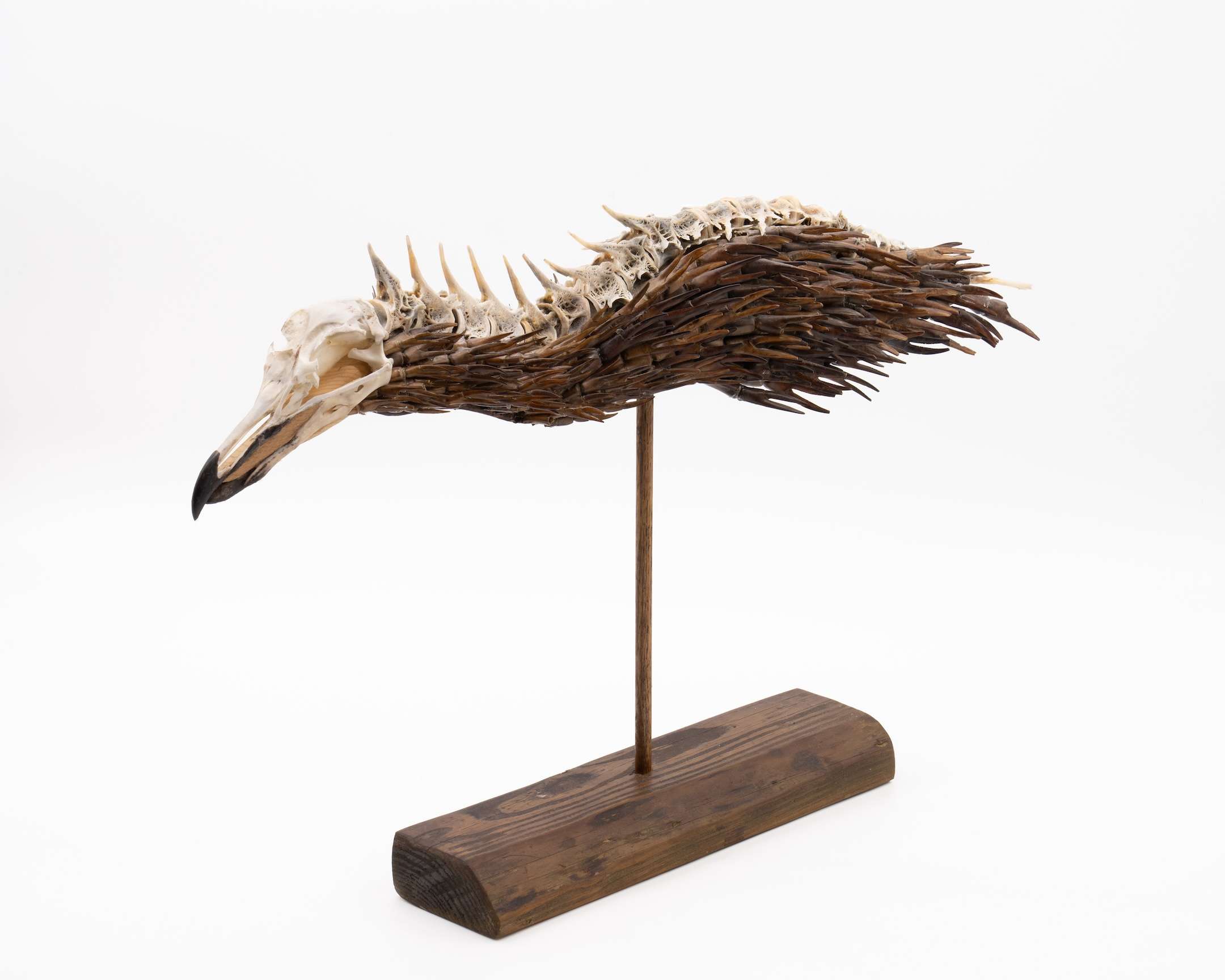 Guided by a blend of instinct, poetic attention, and deep connection with animals, I collect textural materials that hold memory and meaning. Each sculpture begins with exploration, often sparked by a found object. As the work unfolds, precision, intention, and detail guide me. Whether gathering natural elements from shorelines or repurposing discarded materials, I seek to give each fragment a second life through layered storytelling.