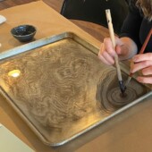 Suminagashi, meaning “floating ink,” is the ancient art of Japanese water marbling. You have a brush in each hand. One hand is dipping ink into the water-filled tray, and the other hand is creating designs in the water with a brush. It is a very relaxing art form with beautiful results.